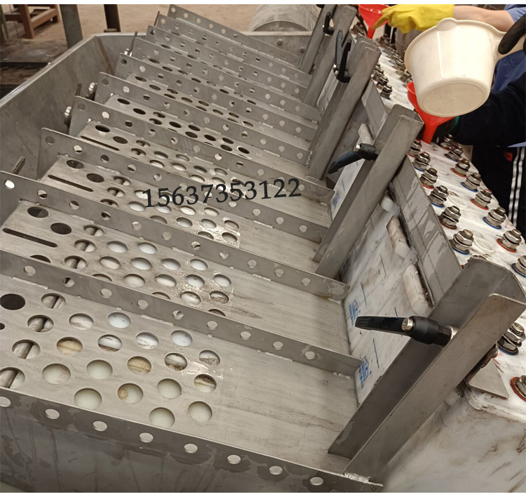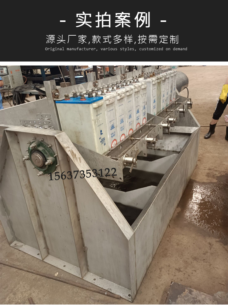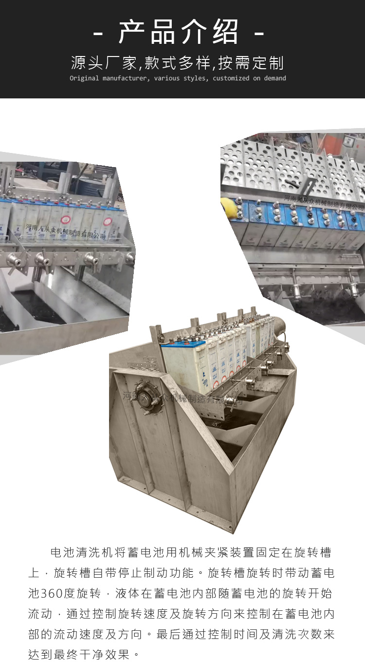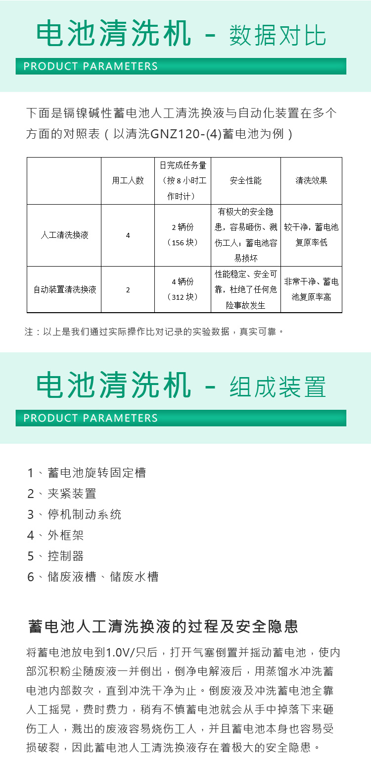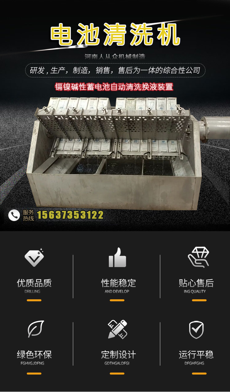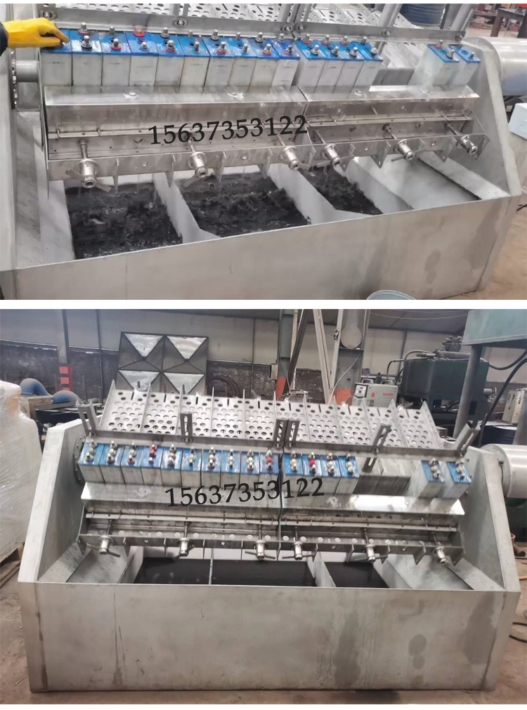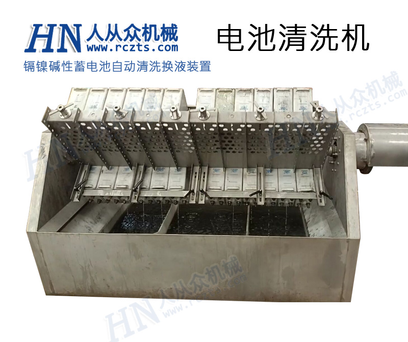 鎘鎳堿性蓄電池清洗換液設(shè)備將蓄電池用機(jī)械夾緊裝置固定在旋轉(zhuǎn)槽上,旋轉(zhuǎn)槽自帶停止制動(dòng)功能。旋轉(zhuǎn)槽旋轉(zhuǎn)時(shí)帶動(dòng)蓄電池360度旋轉(zhuǎn),液體在蓄電池內(nèi)部隨蓄電池的旋轉(zhuǎn)開始流動(dòng),通過控制旋轉(zhuǎn)速度及旋轉(zhuǎn)方向來控制在蓄電池內(nèi)部的流動(dòng)速度及方向。最后通過控制時(shí)間及清洗次數(shù)來達(dá)到最終干凈效果。對(duì)蓄電池的極板無任何損傷,排除了人工清洗的安全隱患。
