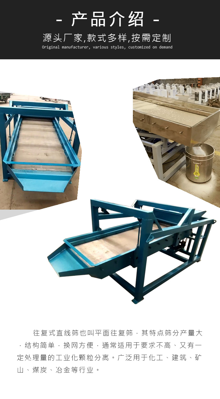 往復式直線篩也叫平面往復篩,其特點篩分產(chǎn)量大,換網(wǎng)方便,通常適用于要求不高、又有一定處理量的工業(yè)化顆粒分離。廣泛用于化工、建筑、礦山、煤礦等行業(yè)